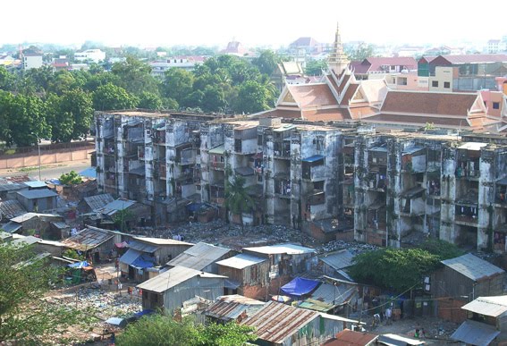 Most current residents would recognize the scruffy-looking White Building, or Boudeng as it’s often called by locals. What many people don’t realize is that the nearby, modern-looking Phnom Penh Center was once its sister Gray Building. Ironically the white building is now gray through neglect, while the gray one is now painted white. Quite different in its original construction, the Gray Building was rebuilt in the early 1990s into the more regular square-shaped office block shape we know today. Pictures from that time show the area having still having many open spaces. By the end of that 1990s this was not the case, and a giant shanty-town had spread out between all around the buildings and adjacent areas. No-one really cared about this land for a long time, it was a dirty lawless slum and continued to be till fairly recently. The area was staunchly pro-ruling party, in a city that wasn’t always reliable in that regard. Any sign of trouble and the Tonle Bassac crew could be relied on to lend a hand. This became less important over the years though, and as investment mushroomed in Cambodia, land became hugely valuable. At the same time I’d imagine that there were decisions made to get rid of many of the slums around town, perhaps because besides being eyesores they were lawless places which a lot of crime in the city emanated from.